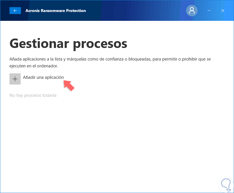 Si pulsamos en el botón “Gestionar procesos” podremos añadir nuevas aplicaciones tal como lo hacemos en las carpetas controladas de Windows 10: