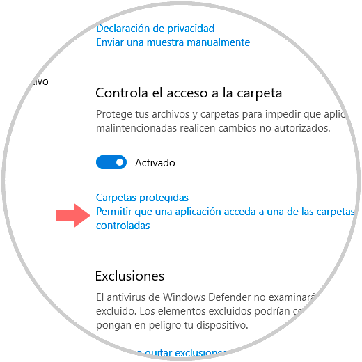 Ahora, la mayoría de las aplicaciones cuentan con acceso a los archivos en las carpetas protegidas, pero es posible permitir que un programa desconocido acceda a estas carpetas, para ello vamos atrás y pulsamos en la línea “Permitir que una aplicación acceda a una de las carpetas protegidas”: