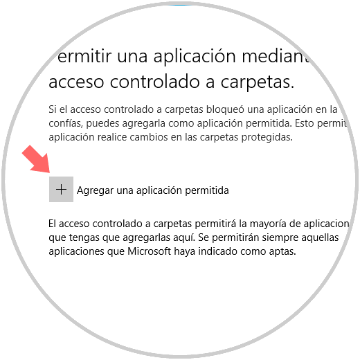 Allí veremos lo siguiente. Pulsamos sobre “Agregar una aplicación permitida” y definiremos cual aplicación tendrá dicho permiso. De esta forma evitaremos que cualquier tipo de ransomware afecte nuestros datos.