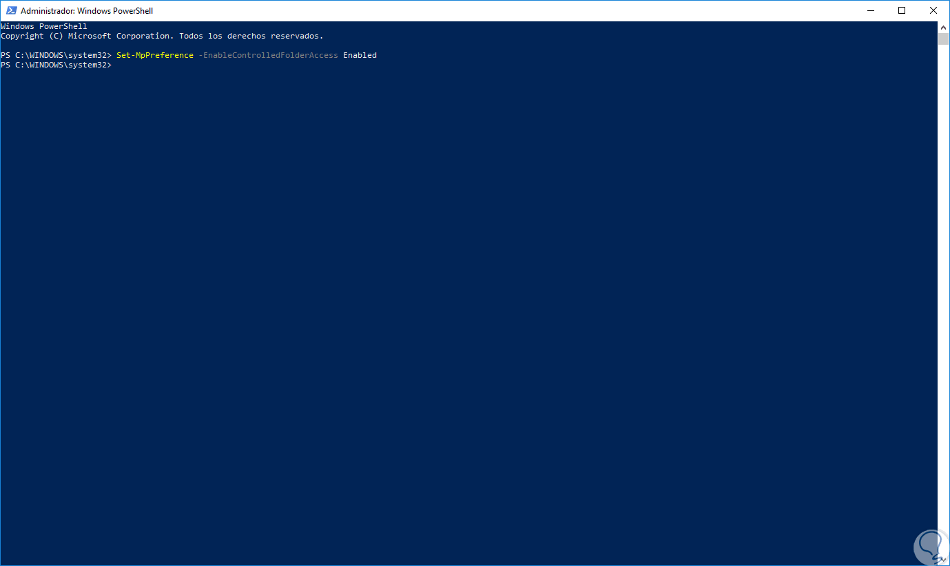 Como método alternativo podremos activar estas carpetas controladas desde Windows PowerShell, para ello, debemos acceder como administradores y ejecutar la siguiente línea: