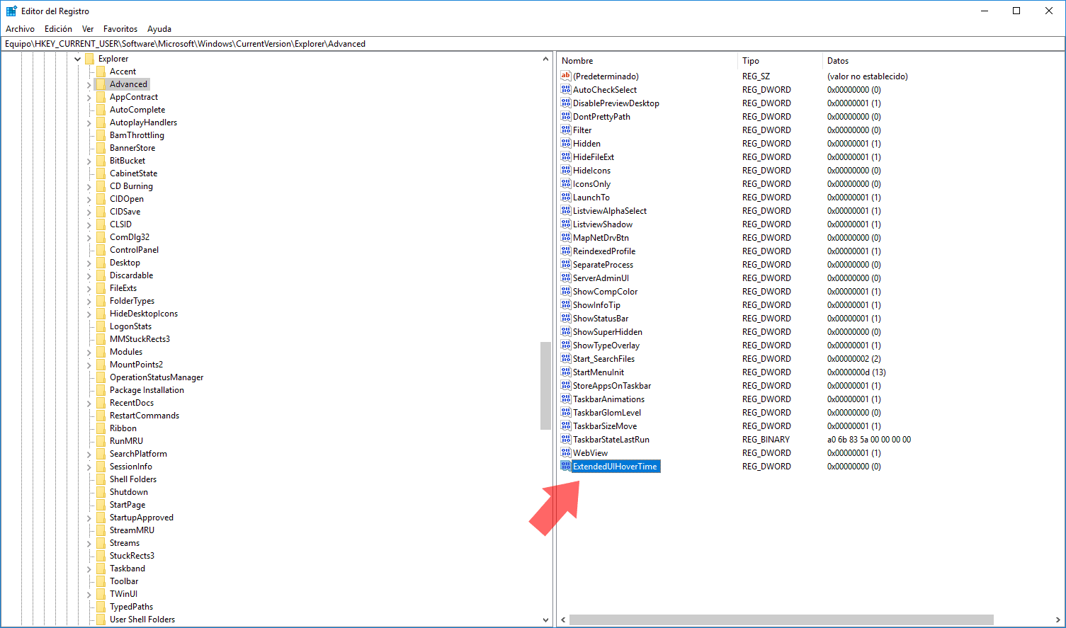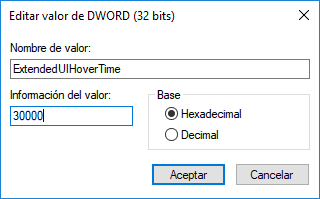 Este nuevo valor DWORD será llamado ExtendedUIHoverTime: