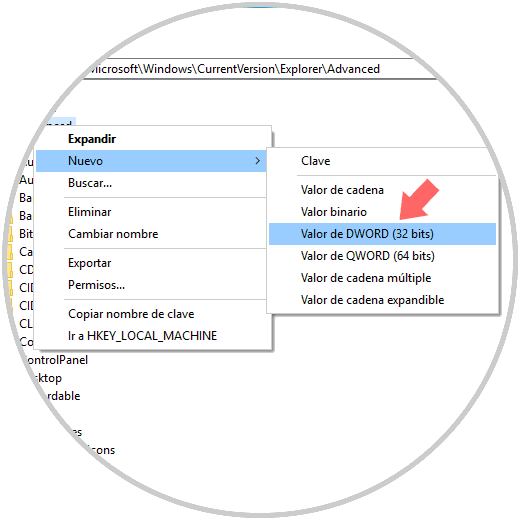 HKEY_CURRENT_USER\Software\Microsoft\Windows\CurrentVersion\Explorer\AdvancedAllí, daremos clic derecho sobre la clave Advanced y seleccionamos la opción Nuevo / Valor de DWORD (32 bits):