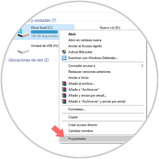 La siguiente opción que tenemos es recurrir a la herramienta integrada en las propiedades del disco duro a la cual accedemos dando clic sobre la unidad elegida y seleccionando la opción Propiedades:
