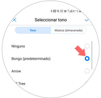 Aquí podrás elegir uno de los tonos disponibles en el listado. Desliza para ir escuchando los diferentes tonos y cuando finalmente encuentres el más apropiado selecciónalo marcando el círculo situado a la derecha del nombre del tono.