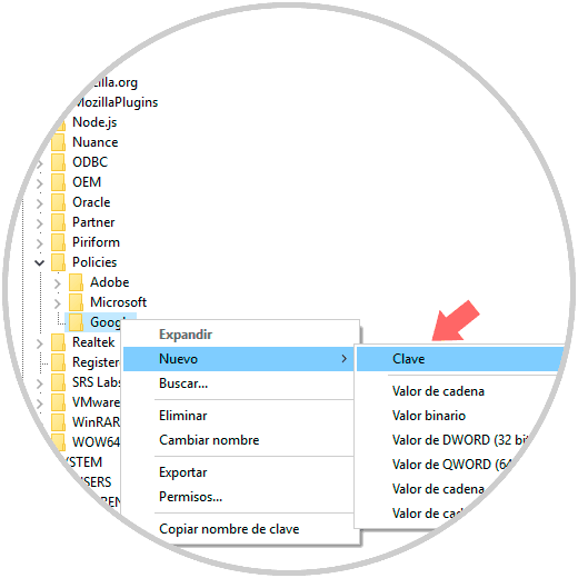 Esta nueva clave será llamada Google y ahora daremos clic derecho sobre Google y seleccionamos la opción “Nuevo / Clave”: