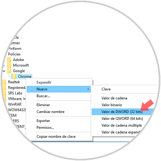 Esta nueva clave será llamada “Chrome”. Una vez creada esta clave, daremos clic derecho sobre Chrome y seleccionamos “Nuevo / Valor de DWORD (32 bits)”: