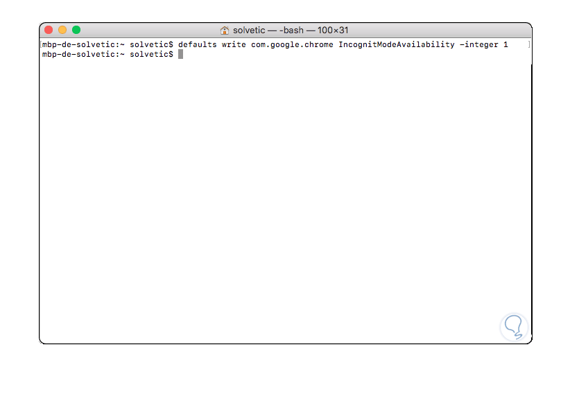 defaults write com.google.chrome IncógnitoModeAvailability -integer 1
