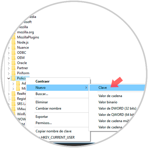 En caso de no ver la clave Google y Chrome bajo Policies será necesario crearlas, para ello, daremos clic derecho sobre Policies y seleccionamos la opción “Nuevo / Clave”: