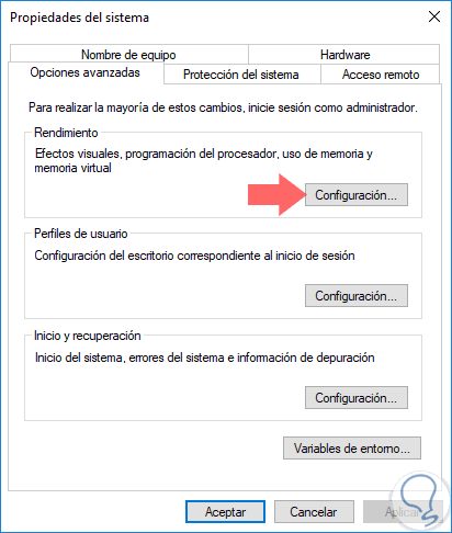 sysdm.cplAhora pulsamos "Enter" o "Aceptar". Sera desplegada la siguiente ventana donde vamos a la pestaña "Opciones avanzadas". Allí pulsamos en el botón "Configuración" ubicado en la sección "Rendimiento"