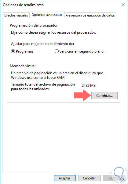 Veremos lo siguiente. Vamos a la pestaña "Opciones avanzadas". Allí pulsamos en el botón "Cambiar" ubicado en la sección "Memoria virtual"