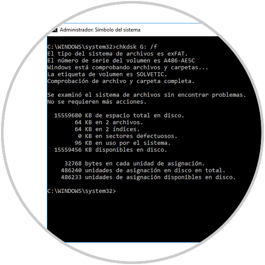 chkdsk Unidad: /fAllí cambiamos Unidad por la letra respectiva.