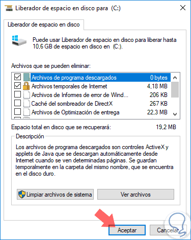 - Seleccionamos la opción "Liberar espacio", la cual desplegará lo siguiente. Allí activamos la casilla "Archivos temporales" de Internet y pulsamos en el botón "Aceptar" para ejecutar los cambios.