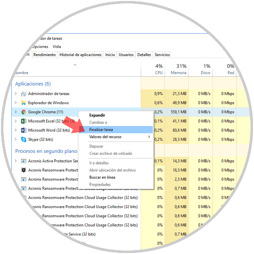 - Una vez validemos que aplicaciones tienen un alto consumo, podremos dar clic derecho sobre ella y seleccionar "Finalizar tarea":
