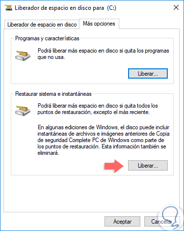 Allí pulsamos en el botón “Limpiar archivos de sistema” y una vez se calcule la cantidad de espacio a liberar veremos la siguiente ventana donde iremos a la pestaña Mas opciones y pulsamos en el botón “Liberar” ubicado en la sección “Restaurar sistema e instantáneas”. Luego pulsamos en Aceptar para salir del asistente.