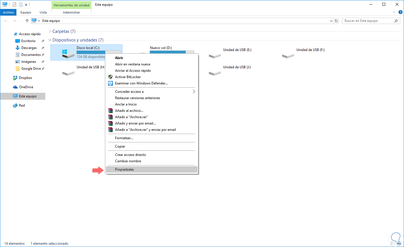 Para ubicar esta carpeta iremos al explorador de archivos de Windows y daremos clic derecho sobre la unidad C donde seleccionamos la opción “Propiedades”: