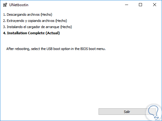 Una vez el proceso finalice veremos lo siguiente. En este punto hemos configurado nuestra USB para que ejecute Ubuntu 20.10. Allí pulsamos en Salir para cerrar el asistente.