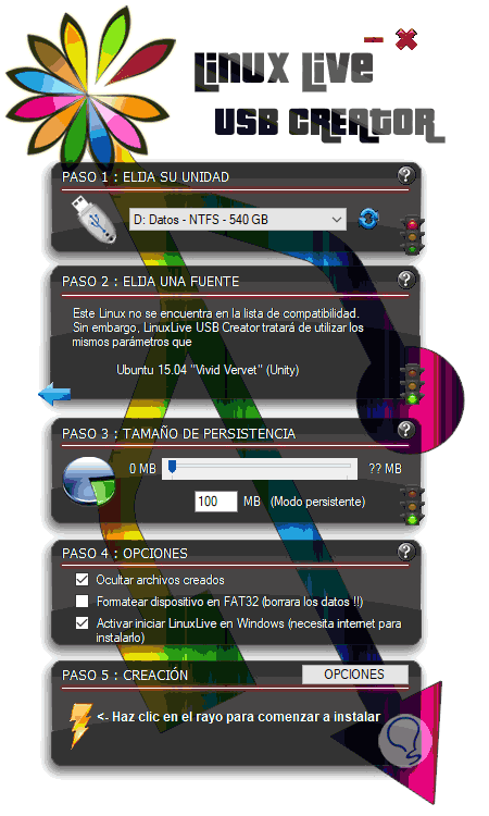Abrimos la herramienta y vemos la siguiente pantalla. Vemos que es realmente de usar esta utilidad pues nos va indicando los pasos. Aquí elegiremos el medio USB, la iso como fuente o el tamaño de persistencia además de otras opciones. Pulsa en el rayo para que comience la instalación del medio USB como boot de Ubuntu.
