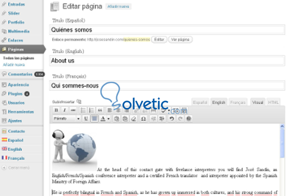 Si alguna la dejamos en blanco, en la parte pública no aparecerá texto alguno. En la imagen que os dejamos a continuación, podéis ver un editor preparado para los idiomas español, inglés y francés.