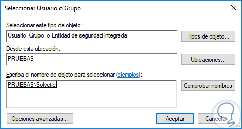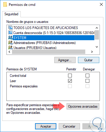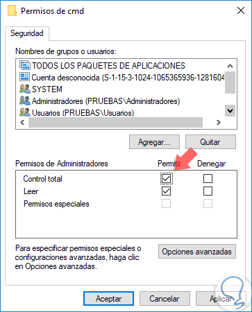 Pulsamos en Aplicar y Aceptar para guardar los cambios. Ahora, en la siguiente ventana seleccionamos el usuario “Administradores” y activamos la casilla “Control total”: