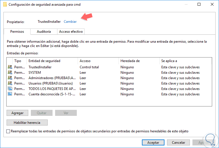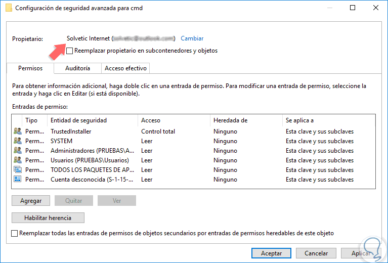Pulsamos en Aceptar y veremos que se ha realizado el cambio de propietario de dicha clave: