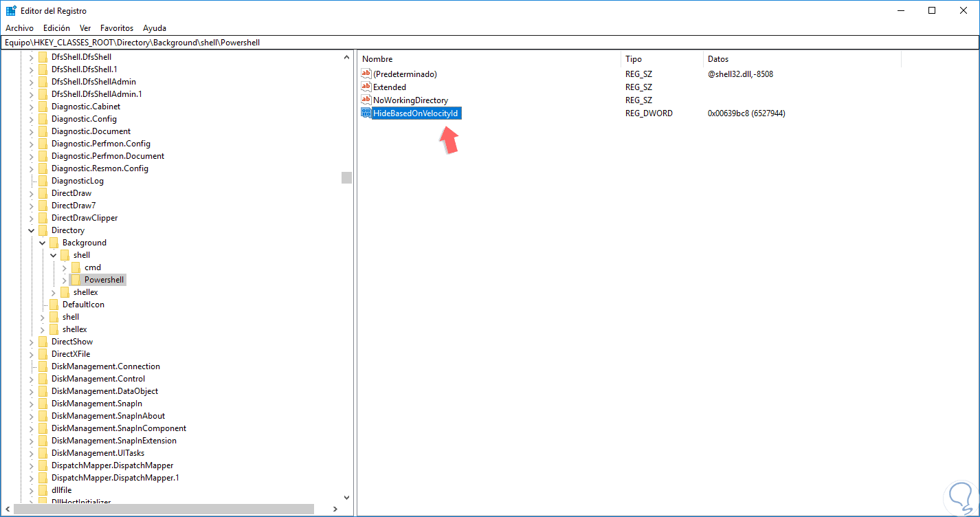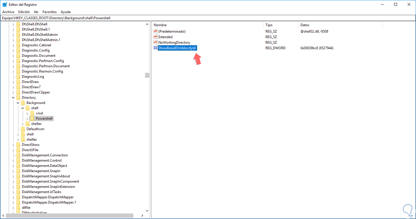 Después de asignados los permisos, damos clic sobre la clave Powershell y veremos allí el siguiente registro “ShowBasedOnVelocityId”: