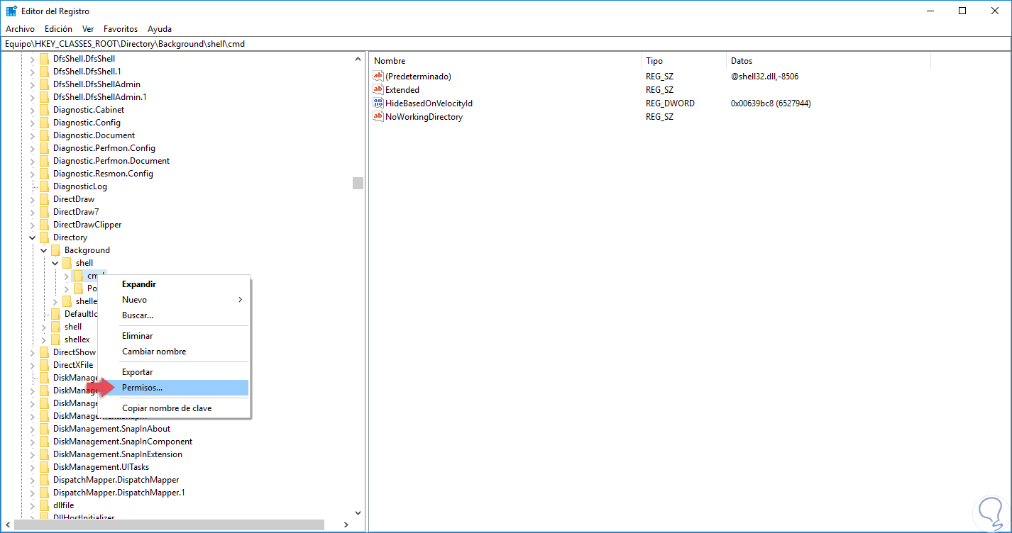 Allí daremos clic derecho sobre la clave CMD y seleccionamos la opción “Permisos”: