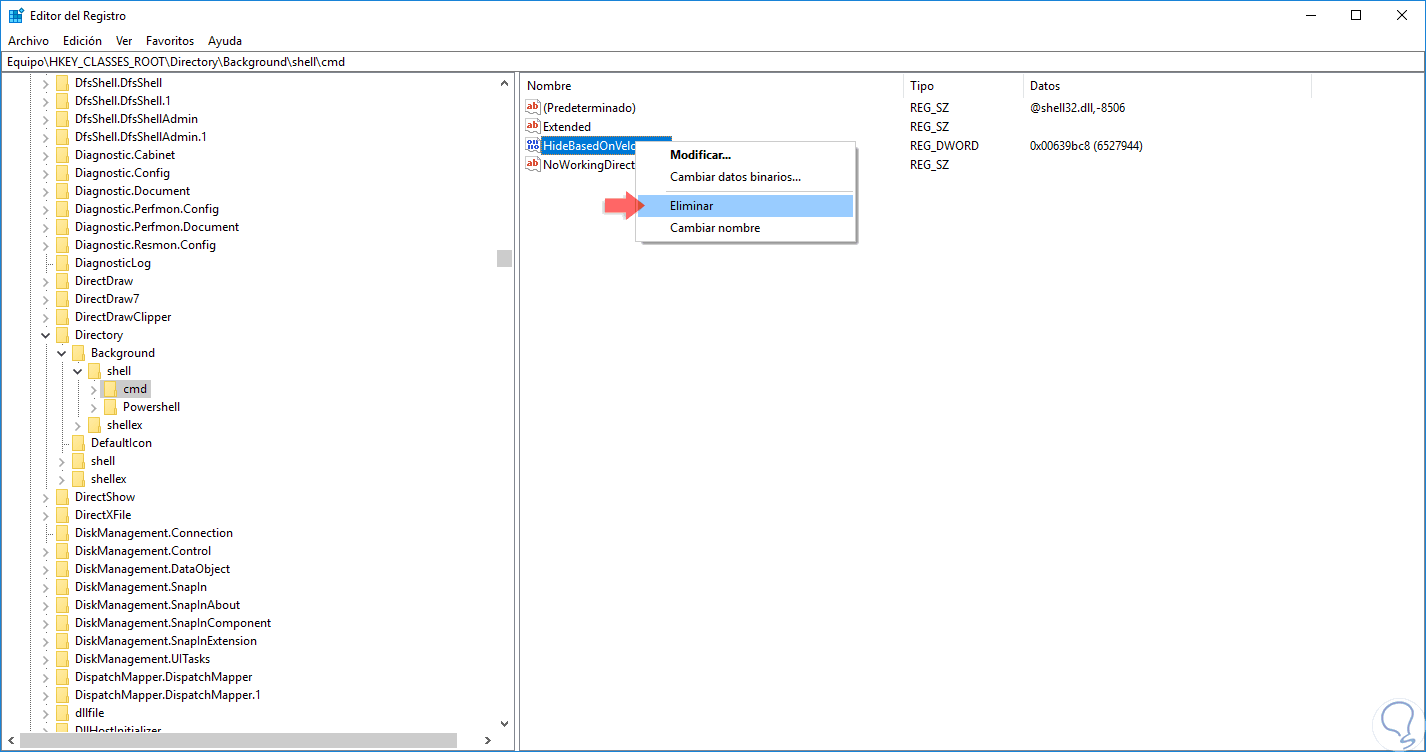 Pulsamos de nuevo en Aplicar y Aceptar para guardar los cambios. Ahora iremos de nuevo a la clave CMD y allí debemos borrar el registro llamado “HideBasedOnVelocityId” dando clic derecho sobre él y seleccionando “Eliminar”: