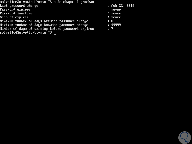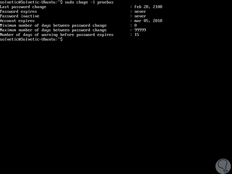 Para esto, es útil el comando chage el cual es usado para modificar la información de caducidad de la contraseña de un usuario específica, nos permite ver la información de antigüedad de la cuenta de un usuario o cambiar el número de días entre los cambios de contraseña y la fecha de la última contraseña.