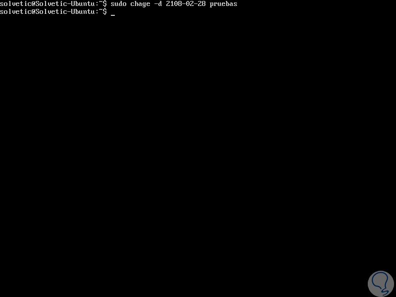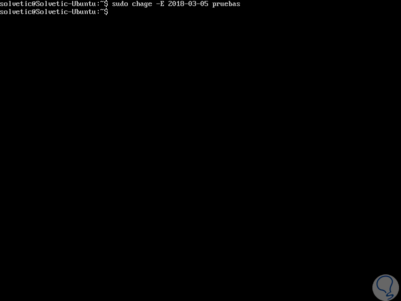 Así, hemos establecido que la próxima fecha de cambio será el día 28 de febrero del 2018. Ahora, gracias al comando chage también sera posible establecer la fecha o el número de días (desde el 1 de enero de 1970) en los que ya no será posible el acceso a la cuenta del usuario seleccionado usando el parámetro -E de la siguiente forma: