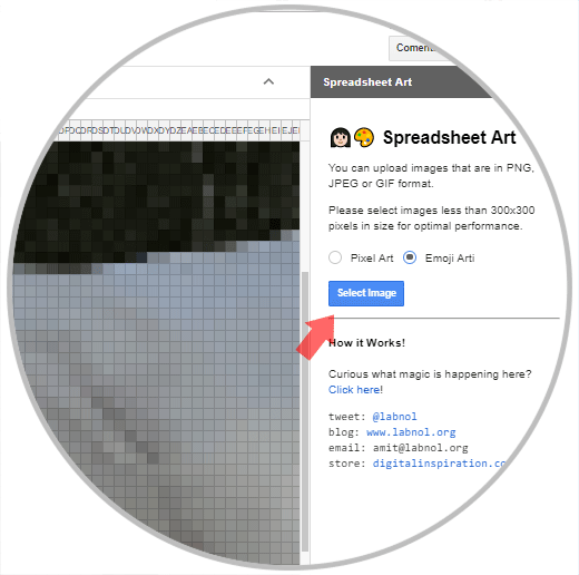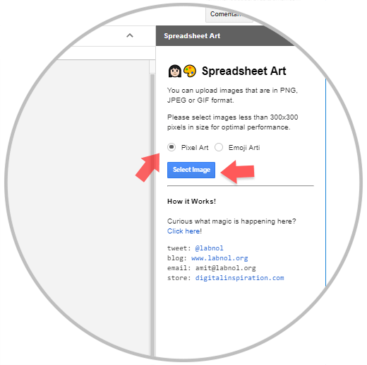 Para iniciar el proceso de creación de nuestro pixel, pulsamos sobre el botón SpreadShet Art y damos clic en el botón Start, podremos ver que se despliega un panel lateral. Allí tenemos dos opciones de edición, Pixel y Emoji.
