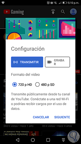 Allí pulsamos sobre el icono de transmisión ubicado en la parte superior y será desplegado lo siguiente. Podremos definir el tipo de calidad a usar y definir si grabamos o transmitimos en vivo.