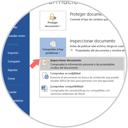 Para esto, vamos al menú Archivo y en la sección Información pulsamos sobre la opción Inspeccionar documento y allí seleccionamos la opción Inspeccionar documento:
