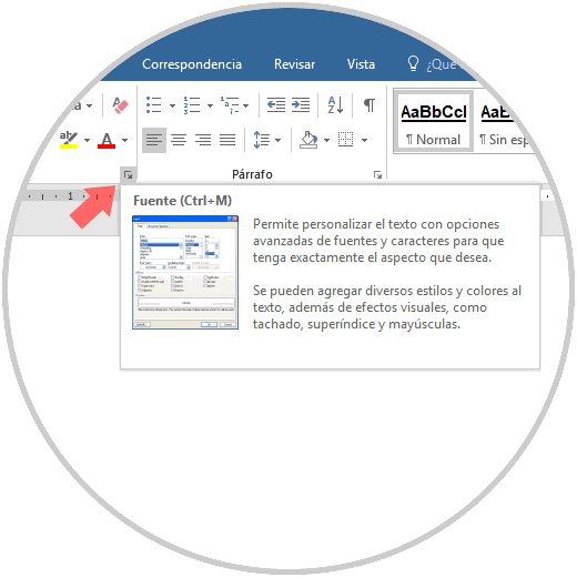 Para lograr editar la fuente por defecto en Word 2016, pulsamos sobre el icono ubicado en la esquina inferior de Fuente en el menú Inicio: