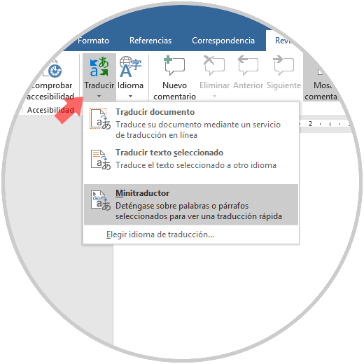 Para esto, vamos al menú Revisar y en el grupo Idioma pulsamos sobre Traductor. Allí podremos seleccionar la opción Minitraductor para contar con el en el documento activo.