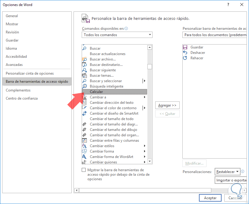 Para habilitarlo, vamos al menú Archivo / Opciones. En la ventana desplegada vamos a la sección Barra de herramientas de acceso rápido, seleccionamos la opción Todos los comandos en el campo Comandos disponibles en y allí seleccionamos Calcular: