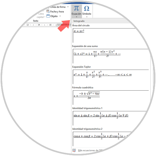 Para agregar una ecuación en Word 2016 iremos al menú Insertar y en el grupo Símbolos pulsamos sobre Ecuación y allí seleccionaremos la deseada: