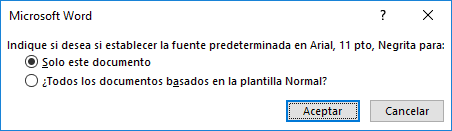 Allí podemos definir si esta selección afectará sólo el documento actual o a todos los documentos que sean creados en la plantilla Normal de Word 2016. Una vez seleccionada la opción deseada, pulsamos en Aceptar para confirmar los cambios.