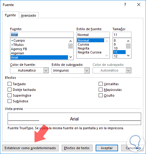 En el cuadro central podremos ver la forma como se vera la fuente en el momento de su escritura y para establecer esta fuente como predeterminada pulsamos en el botón Establecer como predeterminado y veremos el siguiente mensaje: