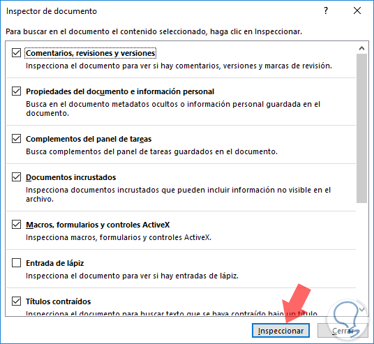El Inspector de documentos es la consola central de Microsoft Word 2016 diseñada para verificar los documentos en busca de cualquier información que sea necesario mantener en privado.