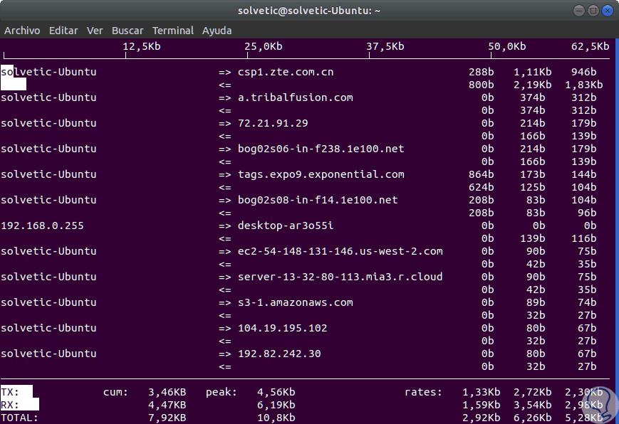 Básicamente el comando iftop nos ofrece una visión continua e interactiva del tráfico de red que pasa por una interfaz de red en la distribución de Linux seleccionada.
