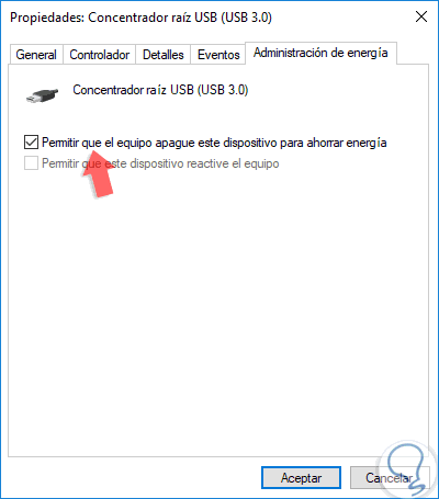 En la ventana desplegada iremos a la pestaña “Administración de energía” y activaremos la casilla “Permitir que el equipo apague este dispositivo para ahorrar energía”. Pulsamos en Aceptar para guardar los cambios.