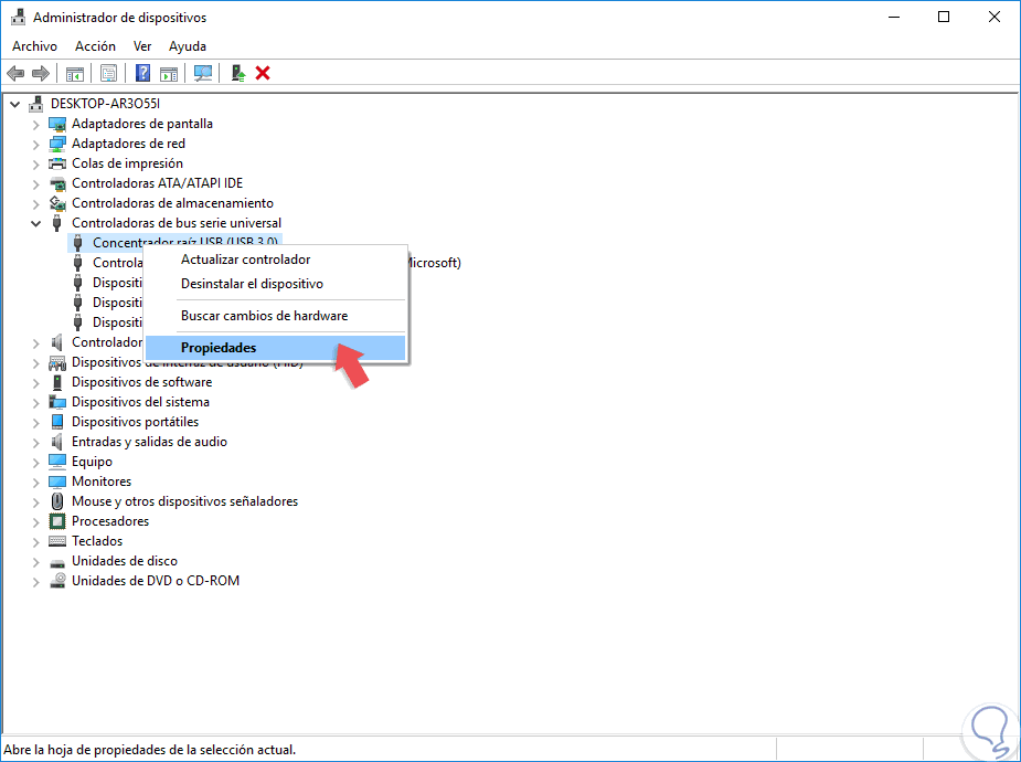Al acceder allí, vamos a la sección “Controladoras de bus serie universal” y daremos clic derecho sobre el puerto USB a editar y seleccionamos la opción “Propiedades”:
