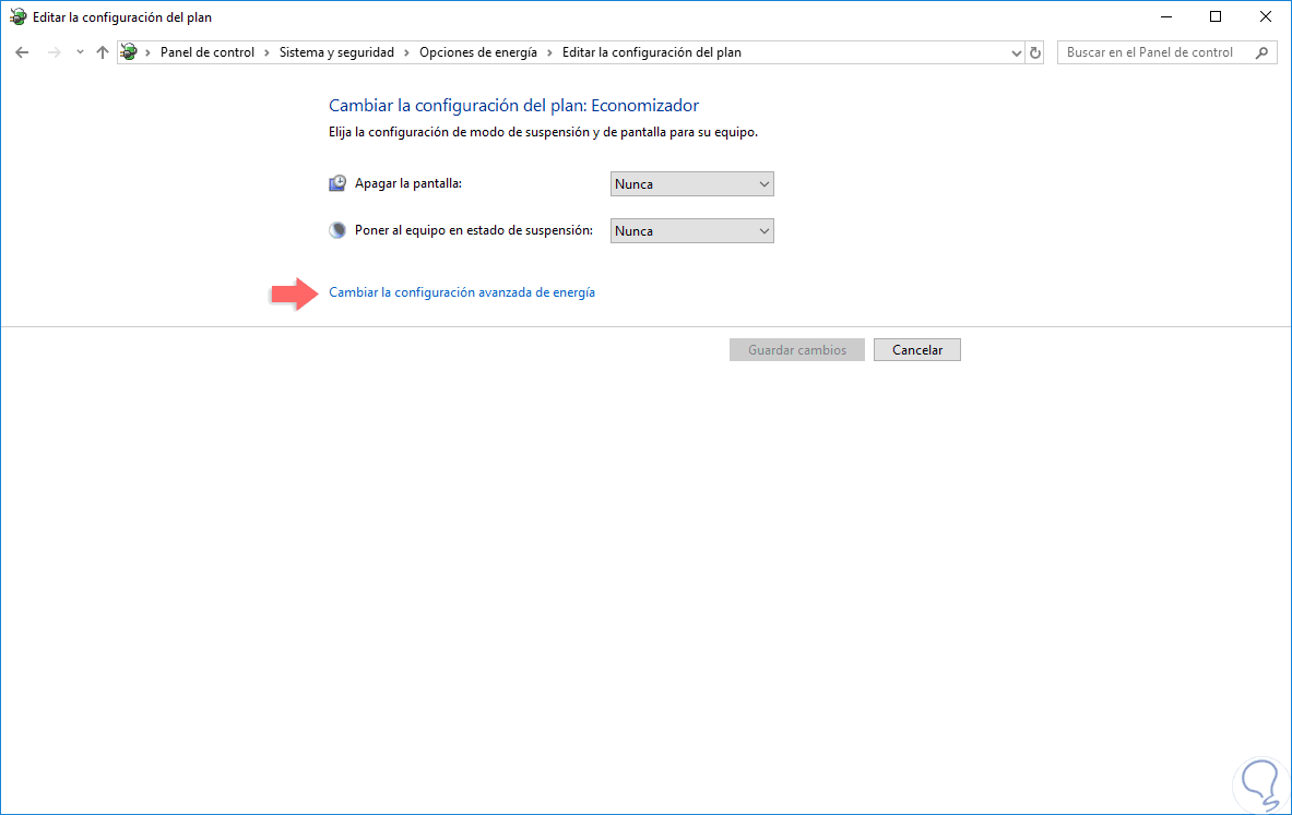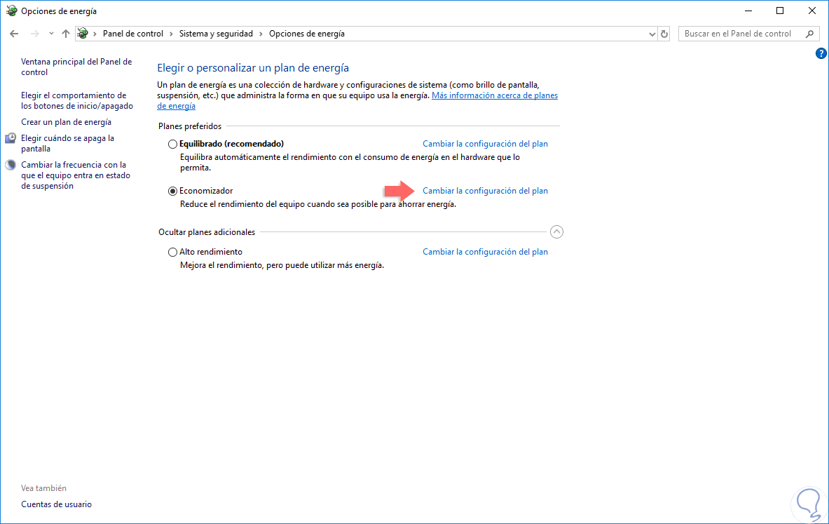 Allí pulsamos en la línea “Cambiar la configuración del plan” y veremos lo siguiente: