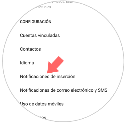 Deslízate hacia abajo, y en la parte de “Configuración” debes seleccionar “Notificaciones de inserción”.