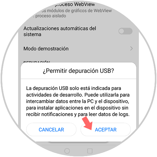 En la parte inferior, debemos activar la opción Depuración por USB la cual por defecto esta inhabilitada pulsando en su interruptor y sera desplegado el siguiente mensaje. Allí pulsamos en Aceptar para confirmar la acción.
