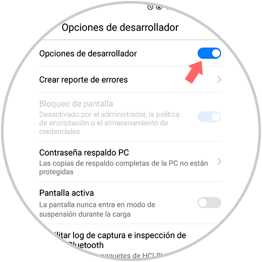 Allí pulsamos 7 veces sobre la línea Numero de compilación para activar el modo de desarrollador. Ahora, iremos a la ruta Ajustes / Opciones de desarrollador y confirmamos que se encuentre activa: