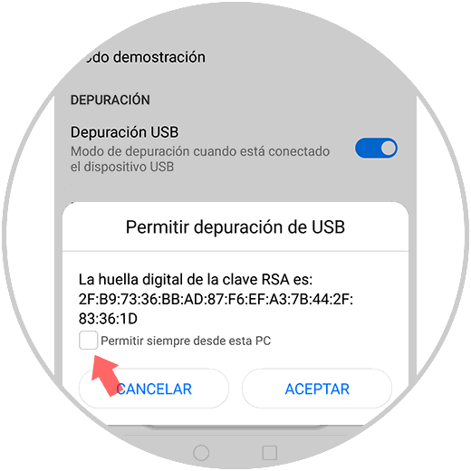 Este paso ya lo hemos habilitado anteriormente. Ahora, procedemos a conectar nuestro teléfono al equipo a través del cable USB y sera desplegado el siguiente mensaje. Allí tenemos la clave digital RSA asociada a la conexión y podemos activar la casilla Permitir siempre desde esta PC si hemos de usar esto de forma continua.
