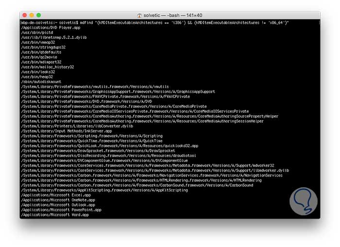 mdfind "(kMDItemExecutableArchitectures == 'i386') && (kMDItemExecutableArchitectures != 'x86_64')"Esto dará como resultado todas aquellas aplicaciones de 32 y 64 bits alojadas en el sistema:
