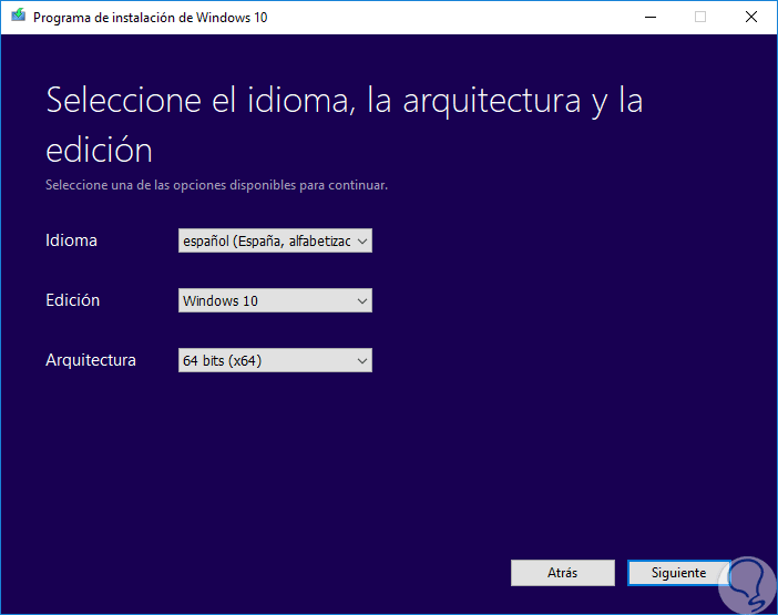Al pulsar en Siguiente podremos definir el idioma y arquitectura a usar: