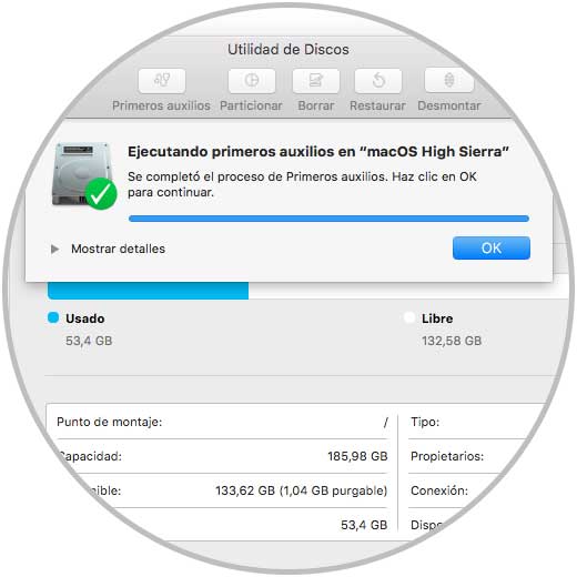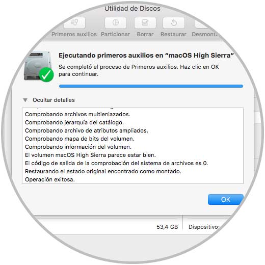 Esta acción tomará tiempo en base a la capacidad del disco duro y una vez finalice el proceso veremos lo siguiente. Allí, si deseamos, podemos pulsar en la línea Mostrar detalles para ver que acciones fueron realizadas o pulsar en OK para salir del asistente.